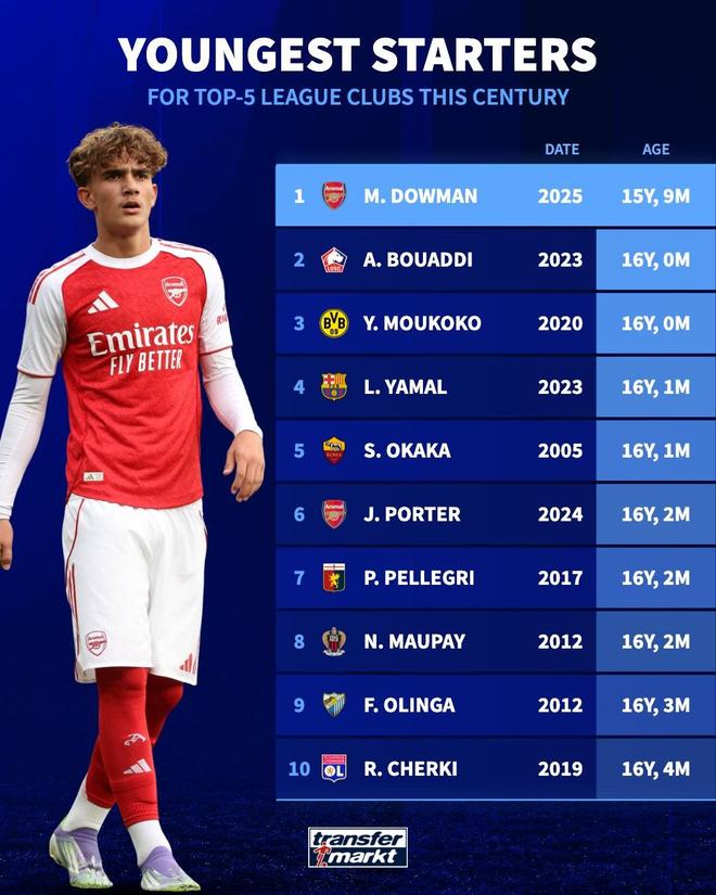 德轉(zhuǎn)列本世紀(jì)五大聯(lián)賽俱樂部最年輕的首發(fā)球員榜單,阿森納的道曼以15歲零9個(gè)月排名榜首。